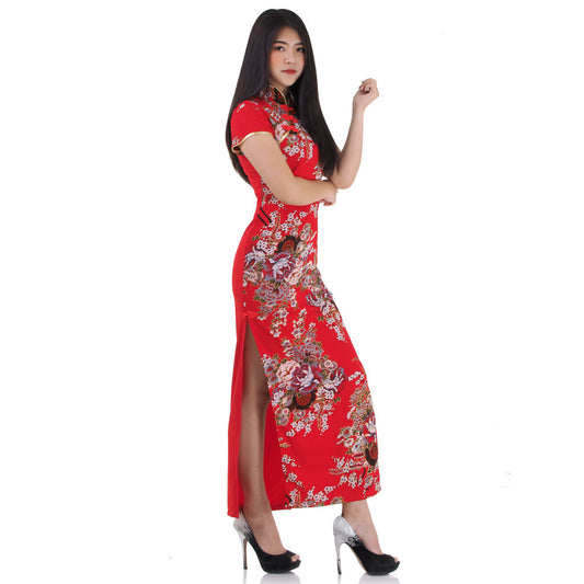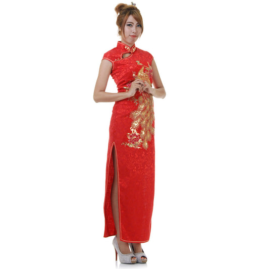 Red Chinese Qipao Blouse with Peacock Embroidery