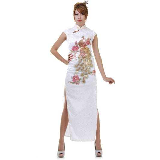 White Chinese Qipao Blouse with Elegant Peacock Embroidery